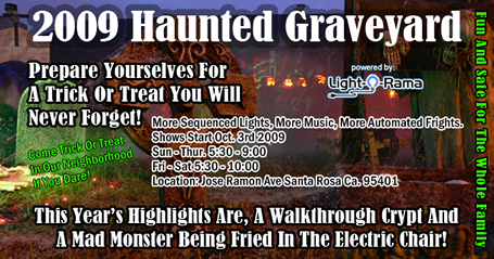 I, Chad, was recently was watching a bunch of Halloween LOR videos to help get me in the mood to sequence our show coming up. I watched a video of this cool graveyard with awesome decorations and lights animated with LOR to add to the mood. After watching it further I realized that this house was located in Santa Rosa and I immediately sent Bill (found out his name after the fact) a message over YouTube. We’ve been talking back and forth about the LOR network and our shows status. It’s great to know that there is a LOR user close to us and Austin and I are looking forward with this new connection with the same interest in LOR displays. He is helping us advertise our show and we are doing the same for his. His show starts Oct 3rd and its worth checking out if you are in the area.